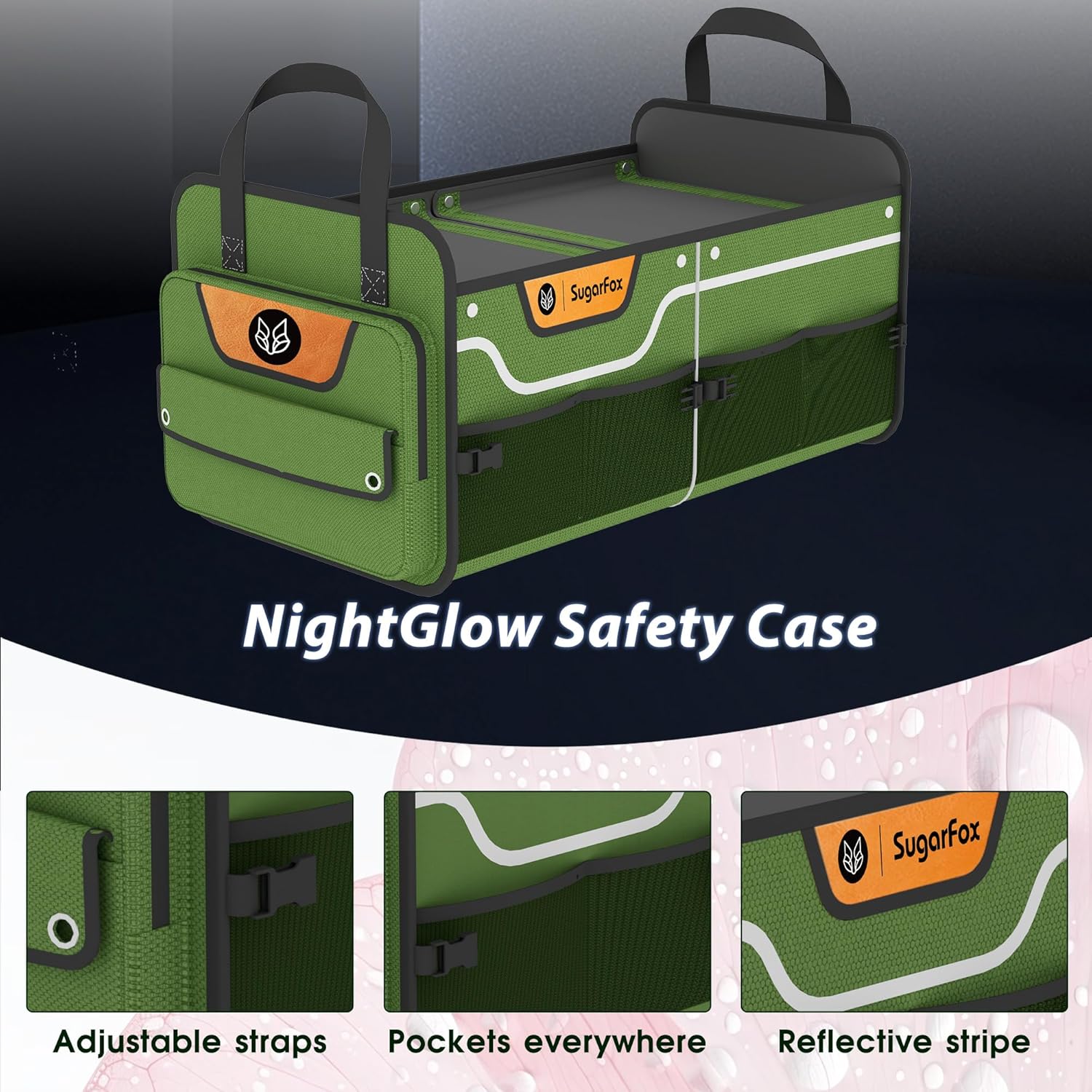 - Safety Features:Featuring 360° reflective strips, this SUV trunk organizer maximizes visibility in low-light conditions, alerting nearby vehicles during dusk or rainy drives. Reinforced with military-grade metal buckles, the trunk organizer for car withstands sudden stops and rough terrain, locking items securely for enhanced driving safety.