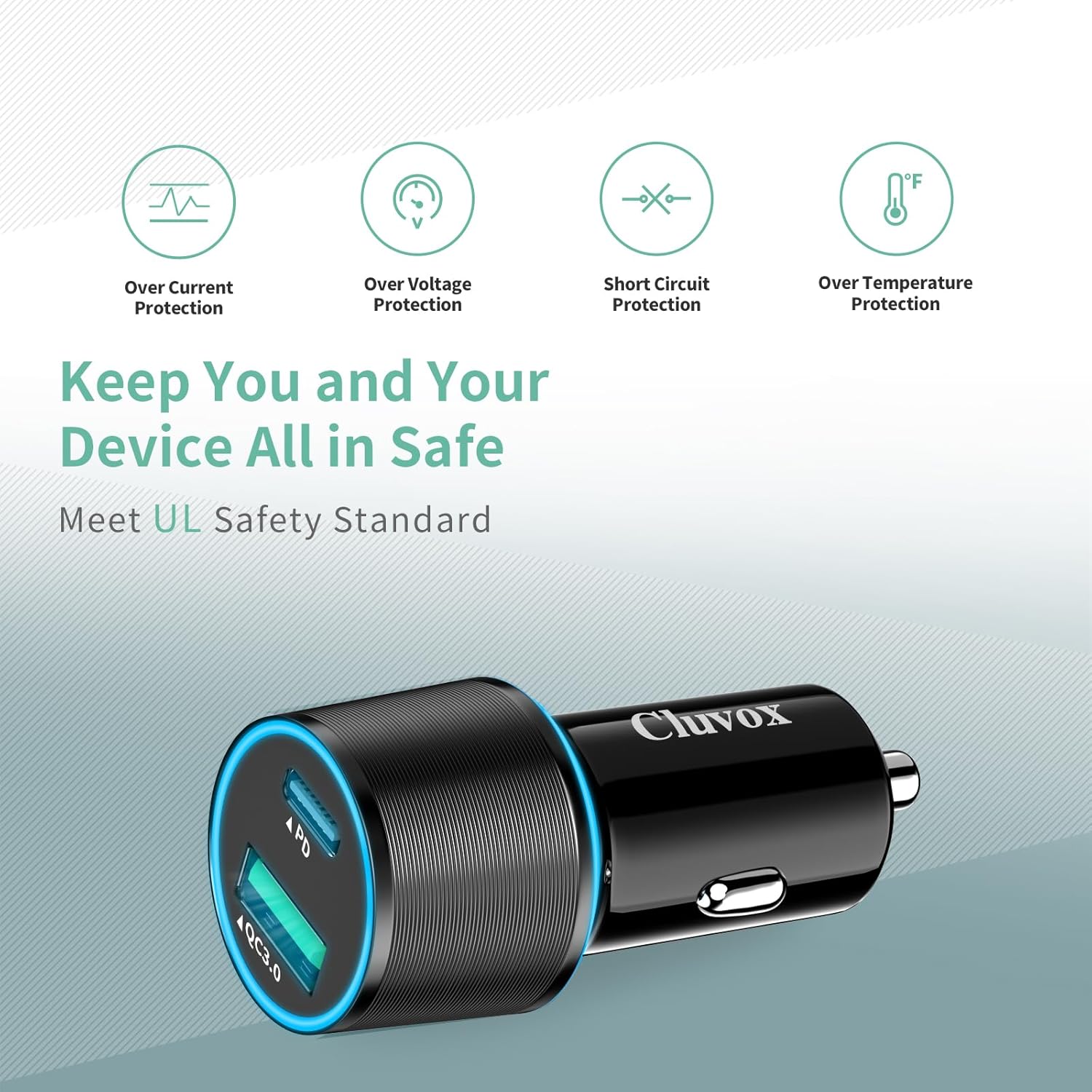 - Keep You & Your Device All IN Safe - Cluvox car phone charger will automatically stop charging when the battery is full to save your battery life. Built-in protection system against over-current, over-charging, and over-heating ensures superior performance, safety, and reliability. You can keep this super fast car charger in your car cigarette lighter socket.
