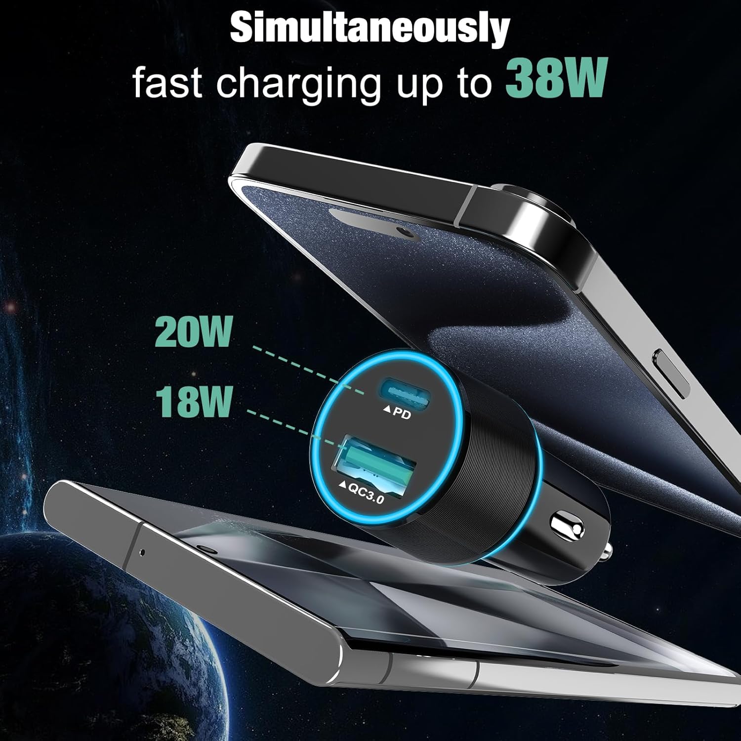 - 38W Fast USB C Car Charger - 20W Type C port& 18W USB A port, dual independent fast charging ports design, the fast charging speed is up to 5X faster than a standard charger, it only takes 30 minutes to charge iPhone 16 from 0% to 60%. Effectively saving charging time. Perfectly charging 2 devices at high speed at the same time.