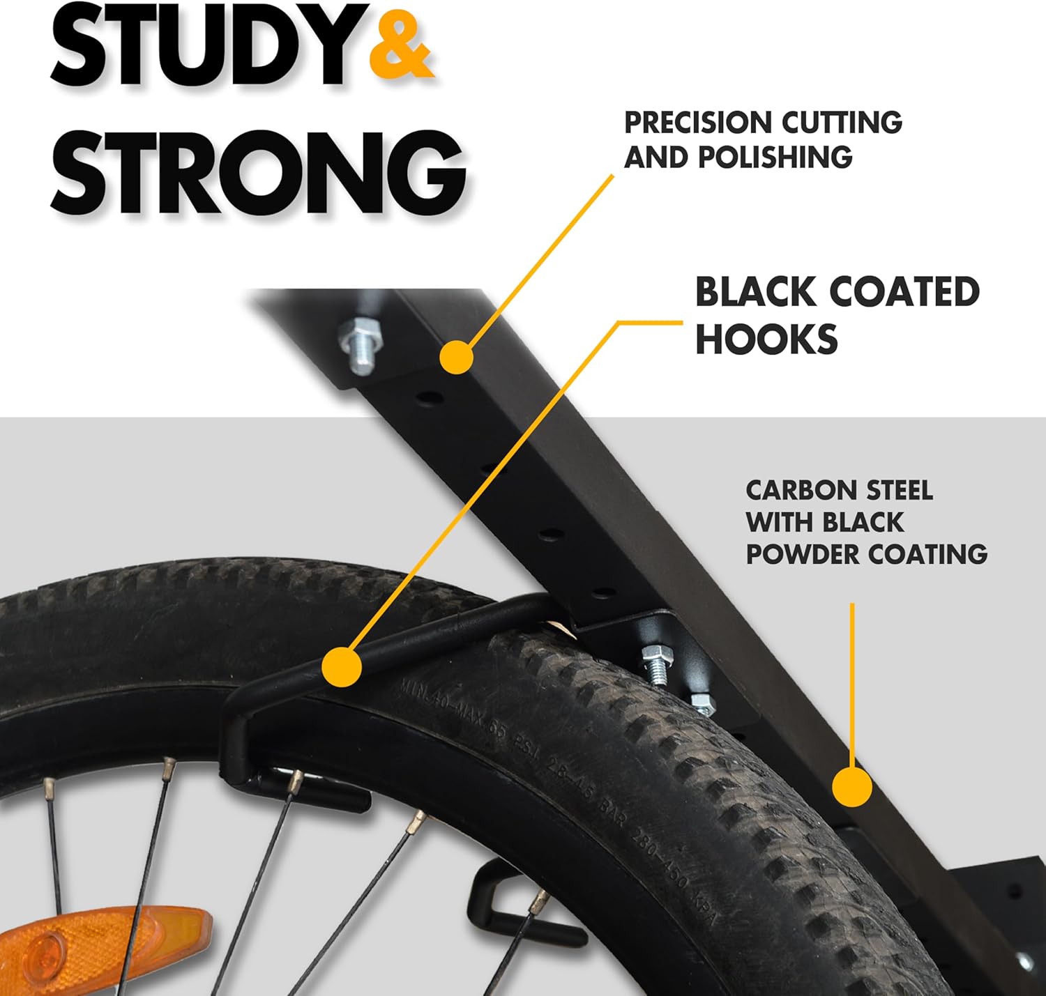 - SMART DESIGN: Optimal bike organization. Each hook is secured in place with a locking pin for easy tool-free adjustment. With tire support bars, your walls will not be scratched. Height can be adjusted from 20" to 76" to fit all bike sizes.