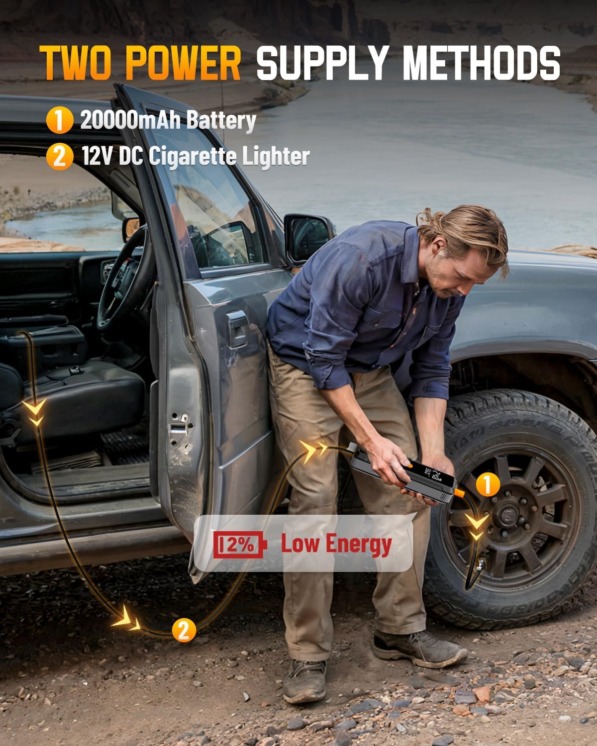 - 【Power That Goes the Distance】Inflate up to 4 tires on a full charge, or plug into your car’s 12V outlet for continuous use. This cordless tire inflator keeps you powered up and prepared—perfect for long drives and unexpected flats.