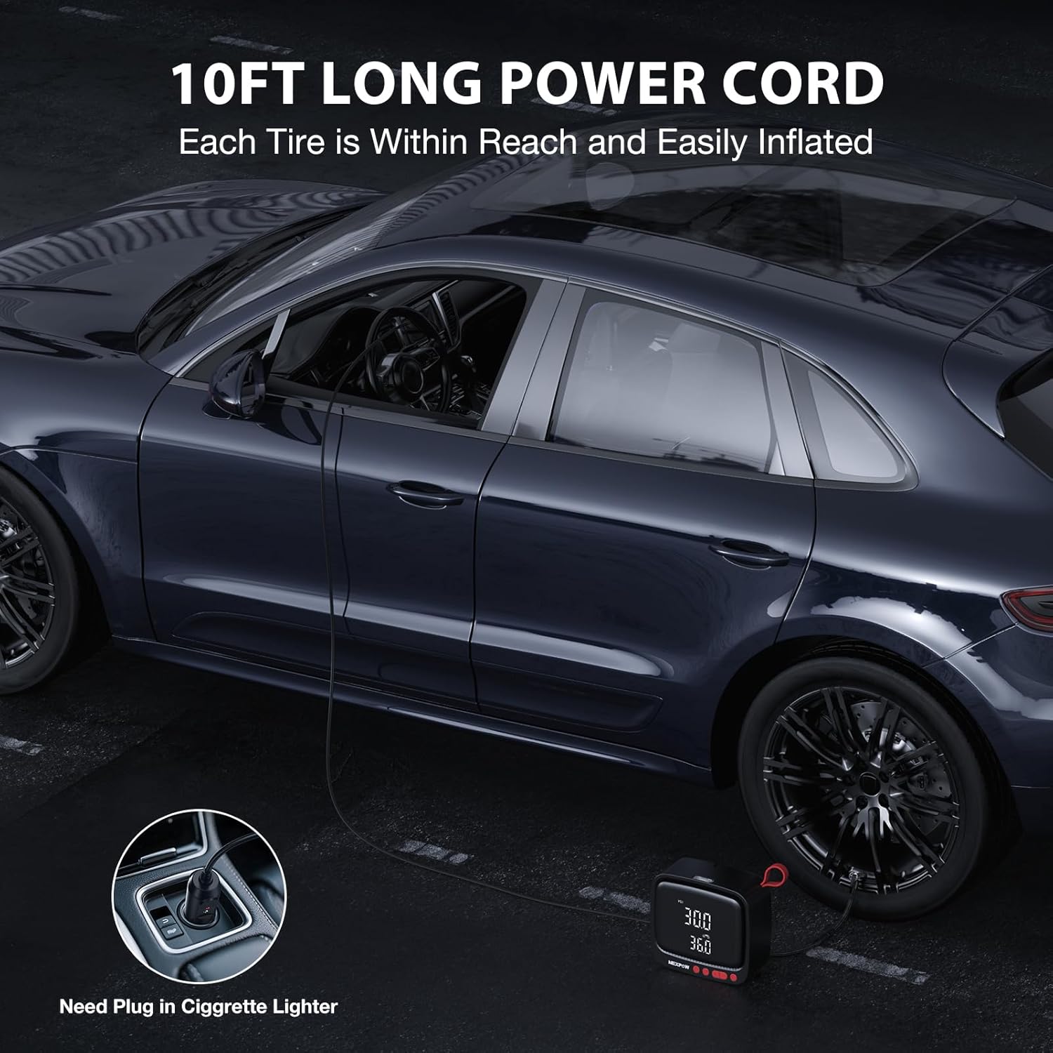 - ULTRA LONG POWER CORD AND COMPACT DESIGN: This car tire inflator is equipped with a 0.5m (1.6 ft) air hose and a 3m (9.8 ft) power cord, making it easy to connect to any tire. The integrated storage compartment on the back facilitates the storage of accessories and makes the tire inflator easier to carry. This convenient design brings a relaxed and easy inflation experience.