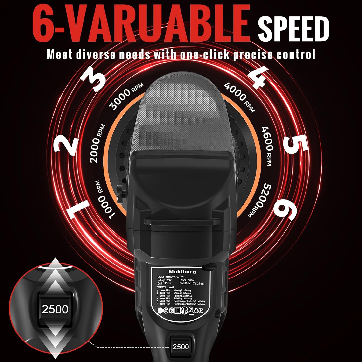 - ă6-SPEED VARIABLEăPortable cordless Buffer Polisher machine With 6 speed adjustable function.Range from 1000 to 5200RPM.Choose lower speeds (1-2) 1000-2000RPM:for waxing and buffing; medium speeds (3-4) 3000-4000RPM: for polishing and cleaning; and higher speeds (5-7) 4600-5200RPM: for effectively removing paint defects and oxidation. The 6-speed adjustment feature is designed to accommodate a variety of work requirements, including but not limited to automotive, marine sanding, furniture finishing, and flooring applications.