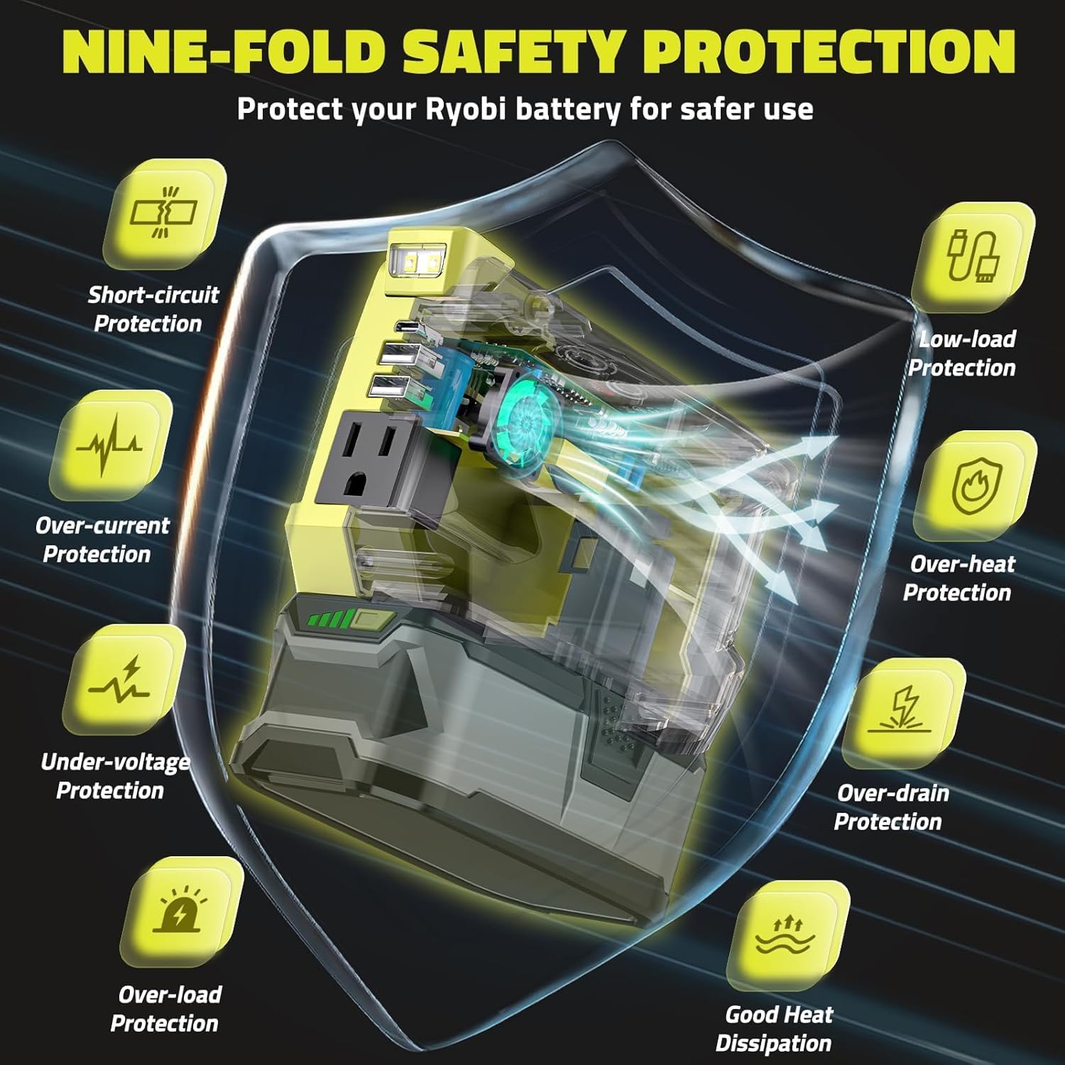 - ▶[Compatible with]:The battery inverter compatible with Ryobi 18V Li-ion Battery: ONE+ P189, P190, P191, P192, PBP002, PBP003, PBP004, PBP005, PBP006, P193, P194, P195, P197, P102, P103 , P104, P105, P107, P108, P109, RB18L50, BPL1820, BPL-1820G, BPL-1815, BPL-18152(battery not include) This power inverter swiftly converts batteries into a portable charger, eliminating the need for bulky adapters. Ensure continuous power for various devices during outages or travel.