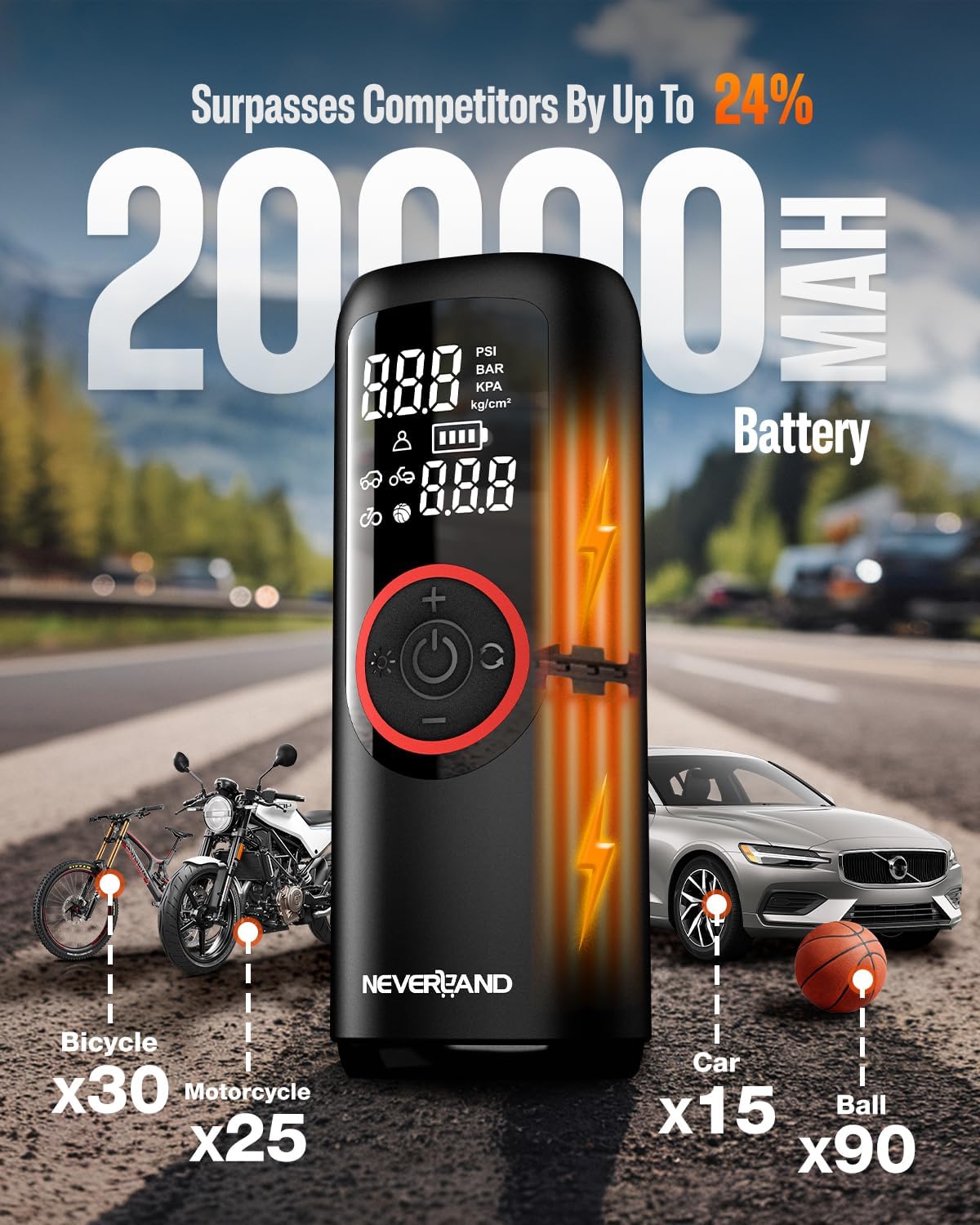 - 【Fast & Accurate Inflation】NEVERLAND digital air compressor tire inflator pumps up a car tire(30-36PSI) in 1 minutes with precise pressure control (±1PSI) and auto shut-off at your preset PSI (3-150 range).