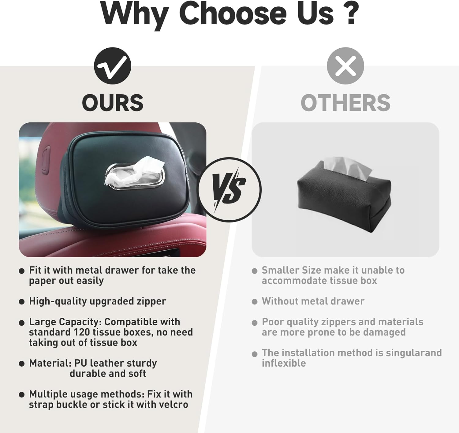 - 【Solve the Problems of Car Tissue】Because the tissue box is frequently tossed to the floor, trampled on, broken and Inconvenient for children to take a tissue, the car tissue holder , which is attached to the seat back of the vehicle with a strong strap buckle, is a preferable choice to help you solve the problems.