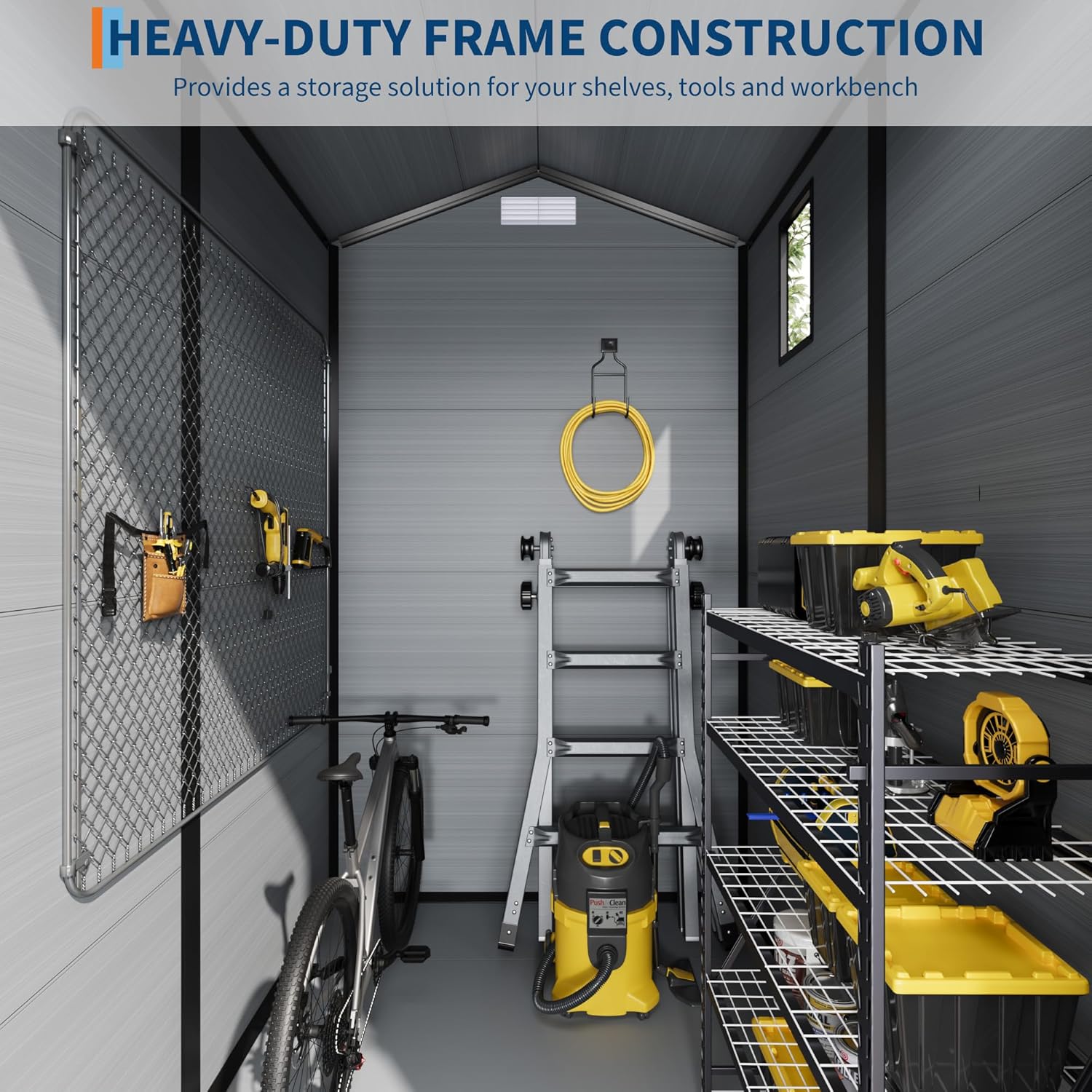 - RESIN MATERIAL - Our outdoor shed resin is crafted from 12MM premium polypropylene resin plastic, which is recyclable and eco-friendly. This resin shed offers exceptional durability, being corrosion-resistant, waterproof, rustproof, and providing over 8,000 hours of UV protection. These features ensure worry-free use in all weather conditions. The double wall panels further enhance its performance, effectively preventing water and moisture ingress