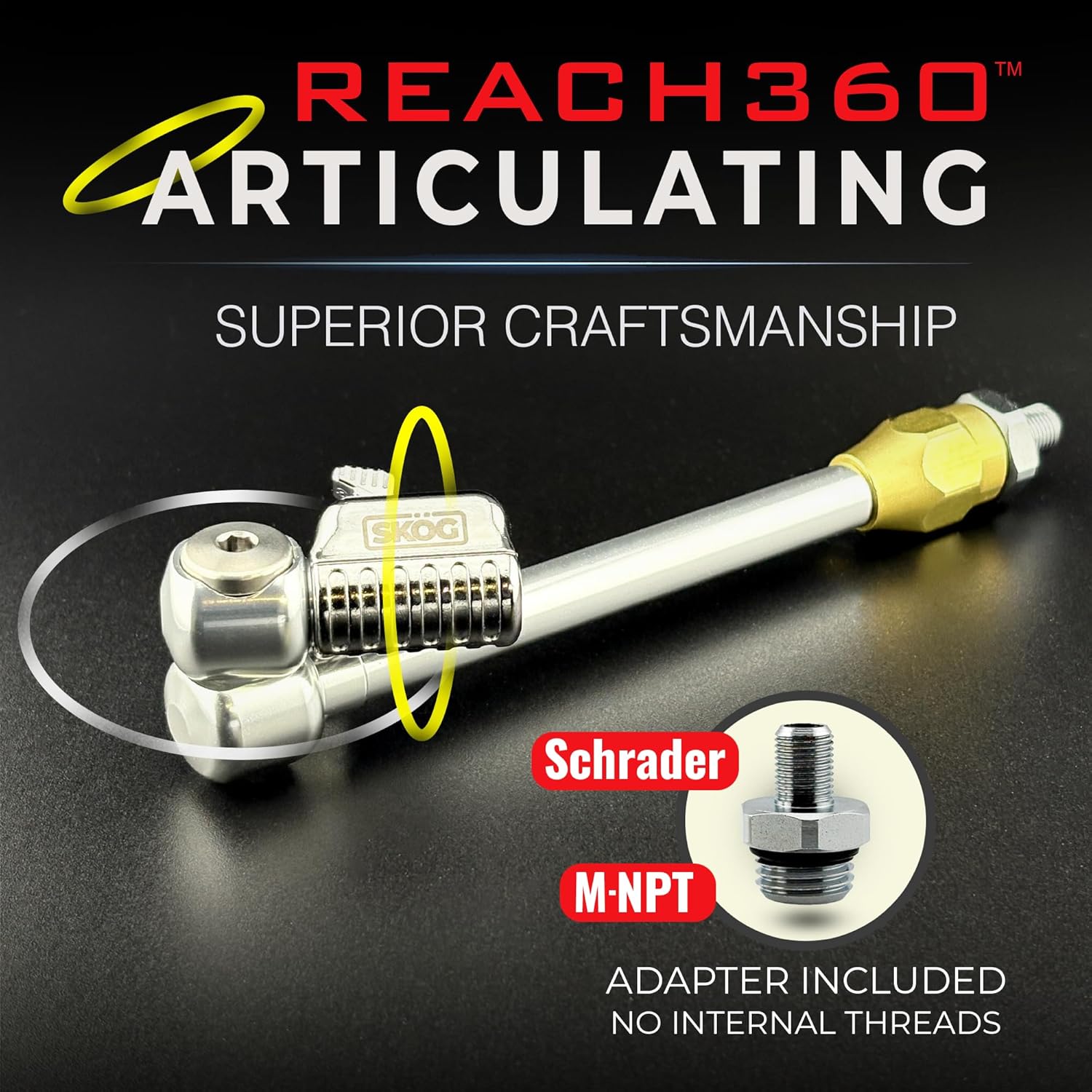 Chuck Mates™ Reach360™ Platinum Series Articulating Rigid 7" Extension with Adapter for Tire Inflators | Dually Trucks RV Bicycle Car Semi
