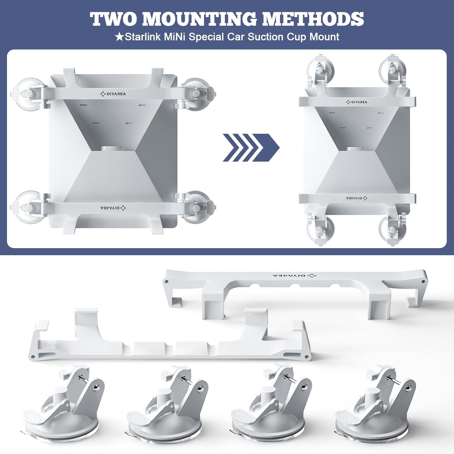 - DOUBLE SUCTION POWER: DIYAREA has upgraded the Starlink Mini Suction Cup Mount, which is made of premium nano gel and ABS material to make it last longer. The suction cups are adhesive, which makes the Starlink Mini car mount more solid and stronger adsorption. The nano adhesive suction cups are stronger than other silicone suction cups and can be widely used on smooth surfaces of objects made of different materials.