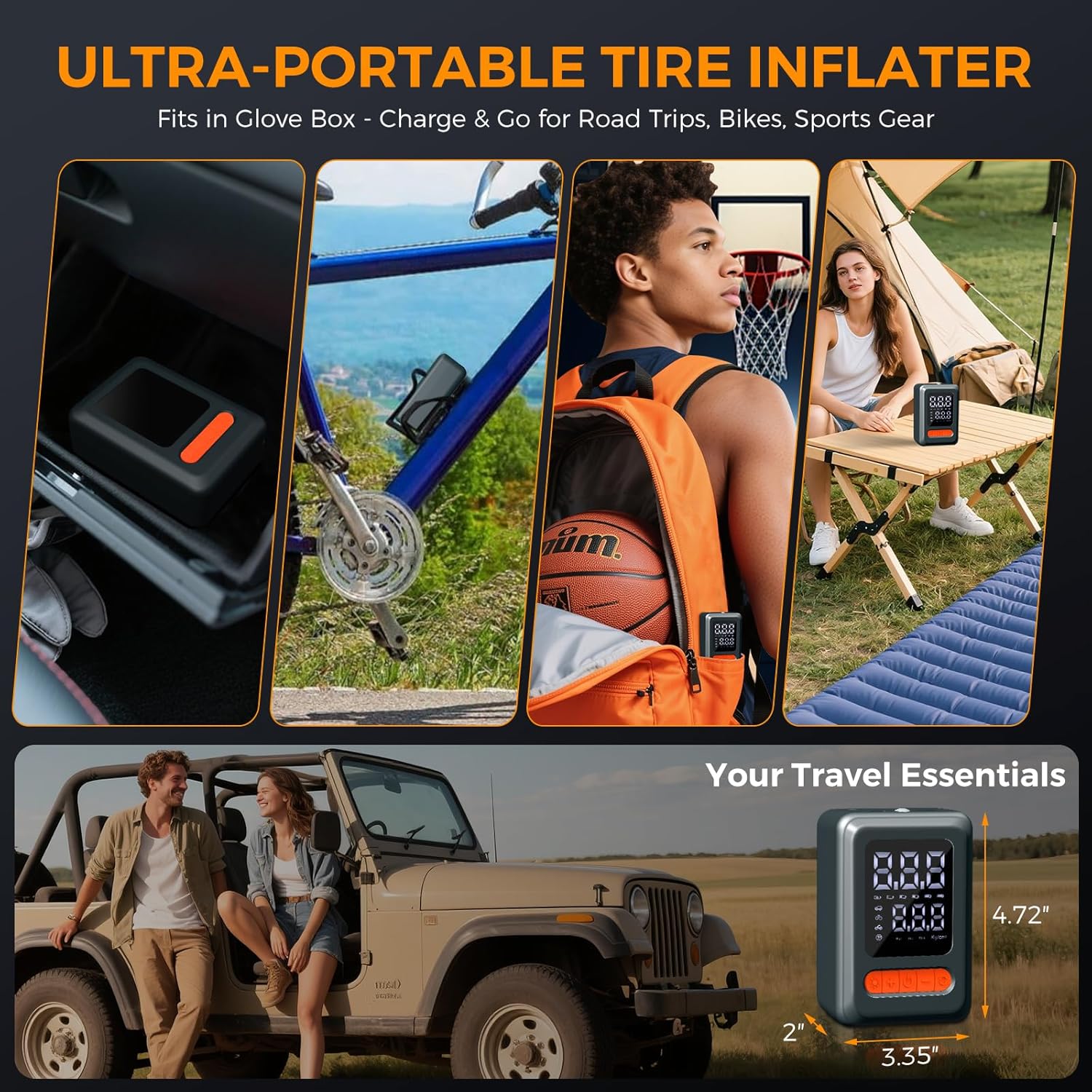 - CORDLESS, PORTABLE TIRE PUMP: Powools cordless bike tire pump features built-in rechargeable batteries, enabling tire inflation anytime, anywhere, without needing an external power supply. Its compact size makes it highly portable. The pump also includes a handy storage bag for easy placement in your car, bike rack, or backpack, making it an ideal companion for both travel and home use.