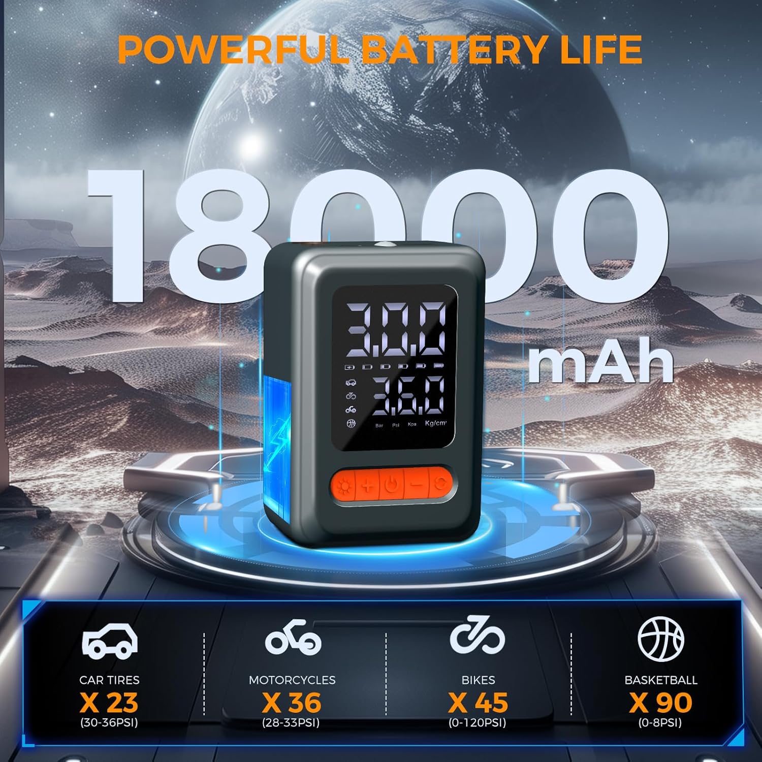 - 3X FASTER INFLATION: Powools portable air pump is born with a powerful motor and a high-performance chip, providing a maximum pressure of 150PSI and a strong airflow. This portable tire inflator for cars can pump up a standard car tire from 30 to 36PSI in less than 1 minute, offering 3X faster inflation than others. It can save you valuable time in emergencies or routine maintenance.
