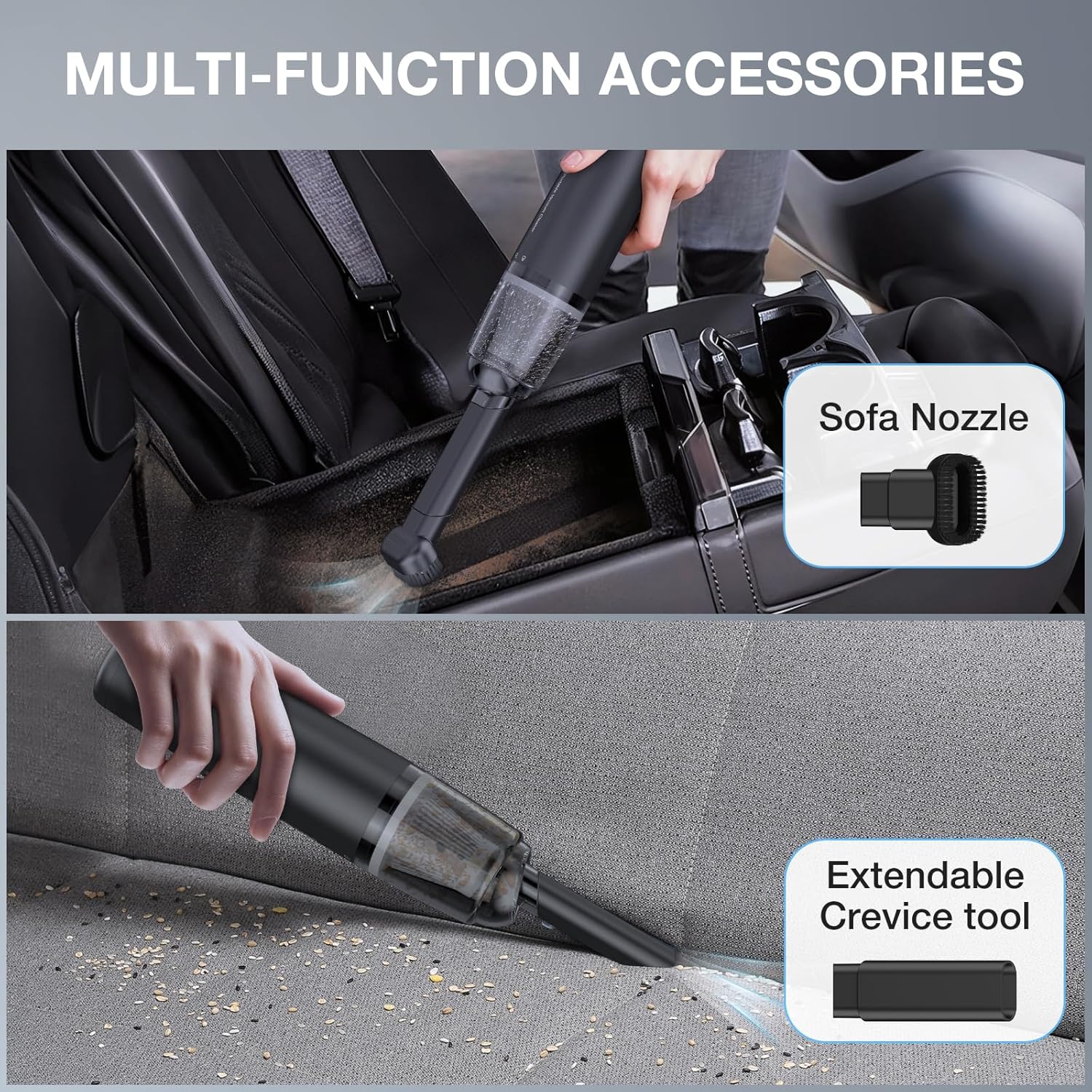 - Super Suction Power 13000Pa :The high-performance car vacuum provides powerful suction power to easily remove dirt and debris from crevices in the car, under the seats, and small debris in the corners of keyboards and desks. Suitable for stubborn stains (e.g. pet hair, snack scraps) for efficient cleaning.