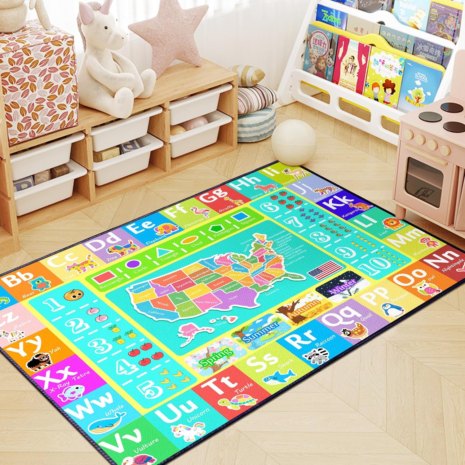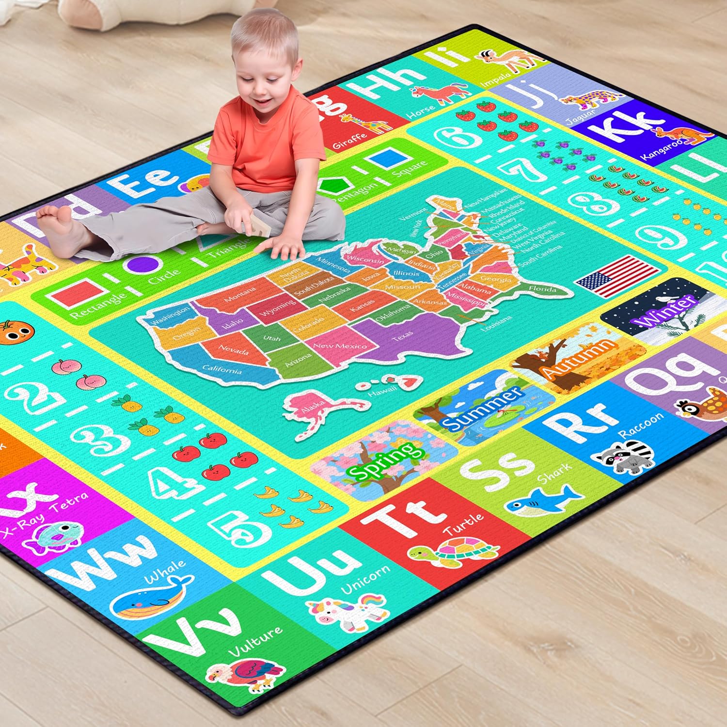 - Educational Elements Galore:Features a colorful US map, ABCs paired with animal illustrations (e.g., Alligator for A), numbers 1 - 11, basic shapes, and seasons. Creates opportunities for kids to explore geography, literacy, numeracy, and seasonal concepts during play.