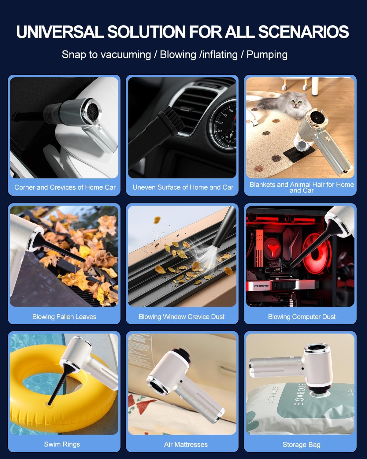 - 👍【Powerful Air Duster and Vacuum Cleaner 4 in 1】four functions: Suction, blowing, inflation, air pump, four functions. You can use it to easily blow away dirt, debris, dust, and other particles from the surface of your items, as well as to suck out the tiny stubborn dirt hidden in keyboards, corners, and crevices. in addition, This versatile tool is more than just a vacuum cleaner. It can inflate inflatable swimming rings and air mattresses, deflate them for easy storage, and even function as a blower to remove dust from keyboards and electronic devices.