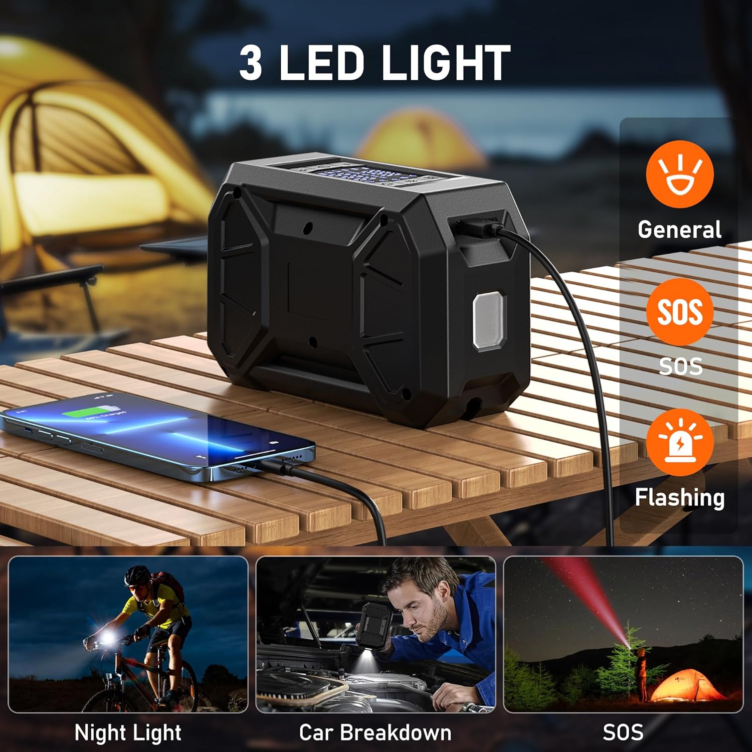 - Multi-Functional Emergency Tire Inflator: This portable tire inflator for cars is not only an ideal choice for inflating equipment, but also a multifunctional emergency tool. It features an LED light with three modes (General, SOS, Flash) that can be used for lighting in the dark, changing tires, or during car breakdowns and emergencies.