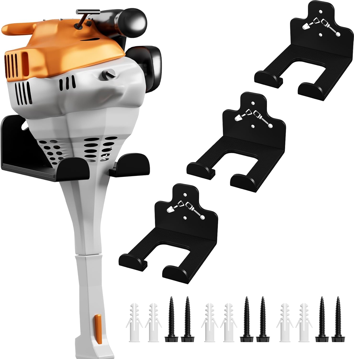 - Easy to Install: Only a few minutes is needed to install the weight bar storage to your wall, our weedeater hanger wall mounted for grass trimmer, hedge trimmer, garage trimmer, garden tools, the perfect tool saving space for your home and workplace,the trimmer hanger hook kit come with 1 racks, 2 screws and 2 expansion tubes.
