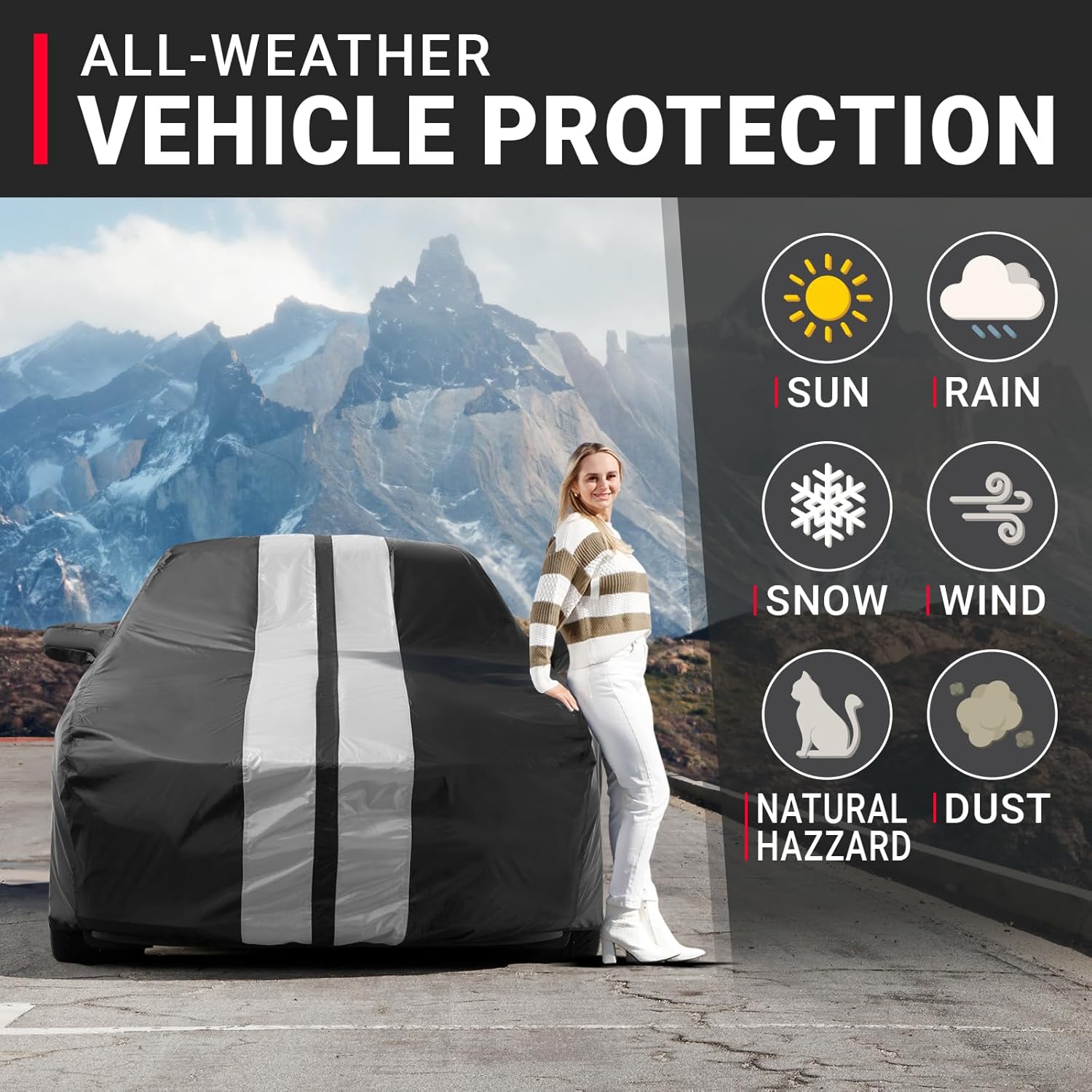 - HEAVY DUTY & HIGH-QUALITY MATERIAL: Crafted from premium, durable materials, this car cover is built to last. Itโs engineered to withstand even the toughest outdoor conditions, offering superior protection against scratches, dirt, UV rays, and other environmental hazards. Designed for long-term use, the high-quality construction resists wear and tear, ensuring your vehicle remains protected year after year.