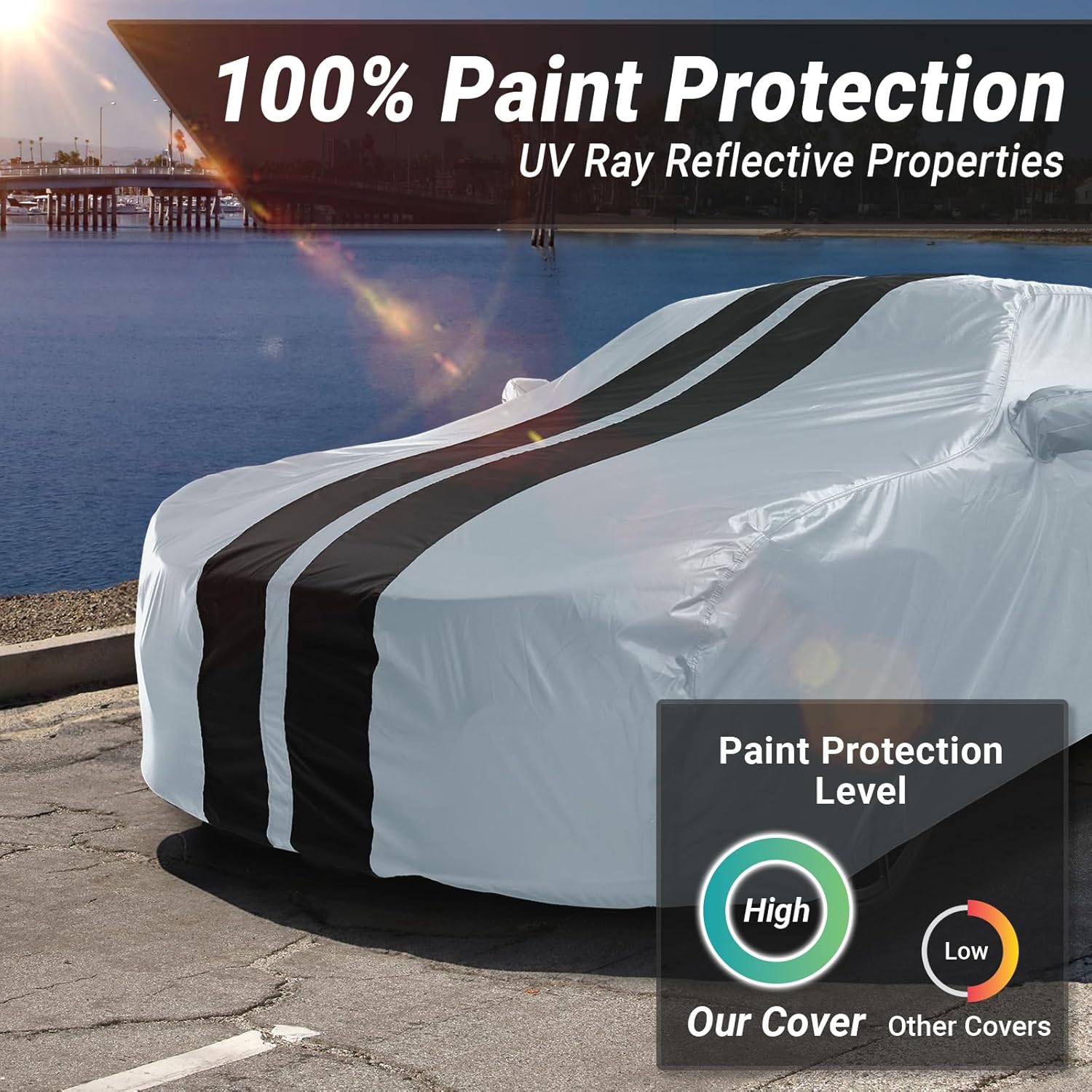 - 100% WATERPROOF & WEATHERPROOF: Designed to effectively repel water, this car cover ensures your vehicle remains dry and shielded from rain, snow, hail, and moisture. In addition, it offers weatherproof protection against harmful UV rays, dust, and dirt, keeping your car safe from the damaging effects of various environmental factors. Whether facing stormy conditions or bright sunshine, this cover provides reliable protection to preserve your vehicleโs appearance.